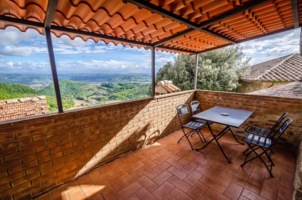 Vanuit de keuken, met stenen gootsteen, is er toegang tot het grote panoramaterras, ideaal voor diners en aperitieven, vanwaar u kunt genieten van een prachtig uitzicht op de vallei beneden.
